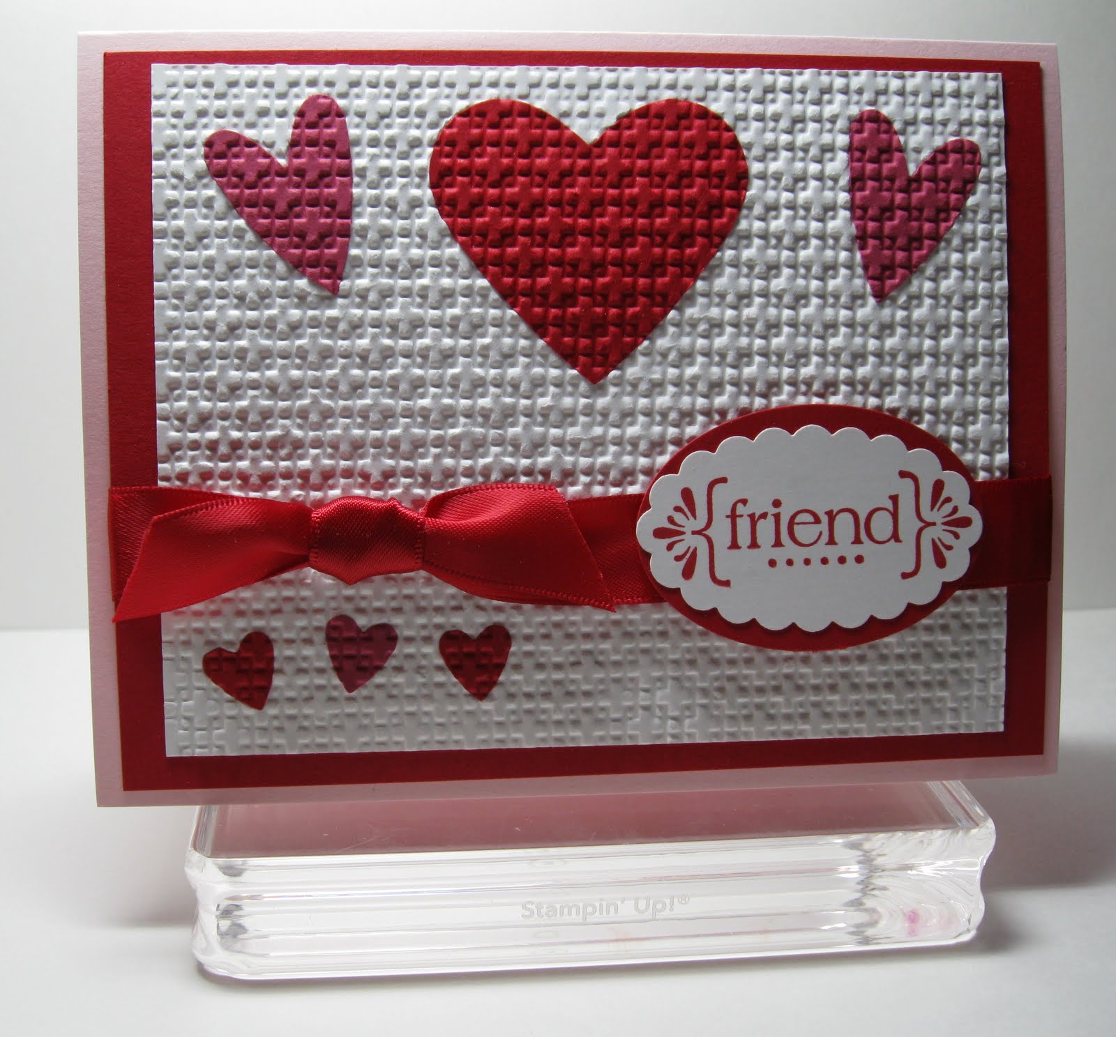 Accessories: Big Shot, Square Lattice Embossing Folder, Full Heart punch, Heart to Heart punch, Heart Small punch, 2x 1 3/8 Oval punch, Scallop Oval punch, Real Red Satin ribbon, Stampin’ Dimensionals