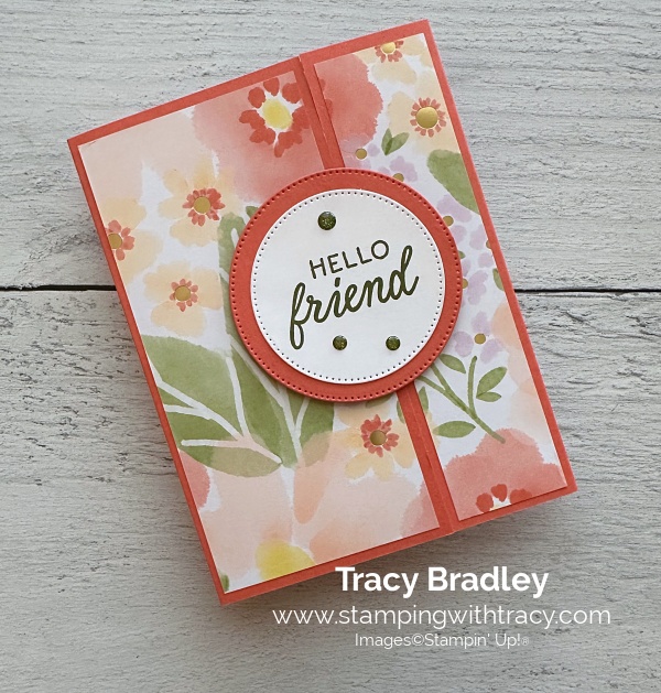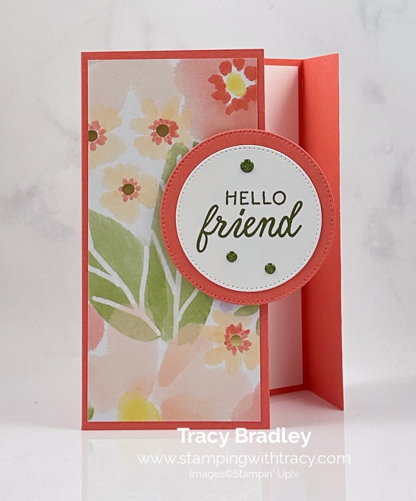 - Calypso Coral cardstock:8-1/2″ x 5-1/2″ scored at 2-3/4″ & 7″