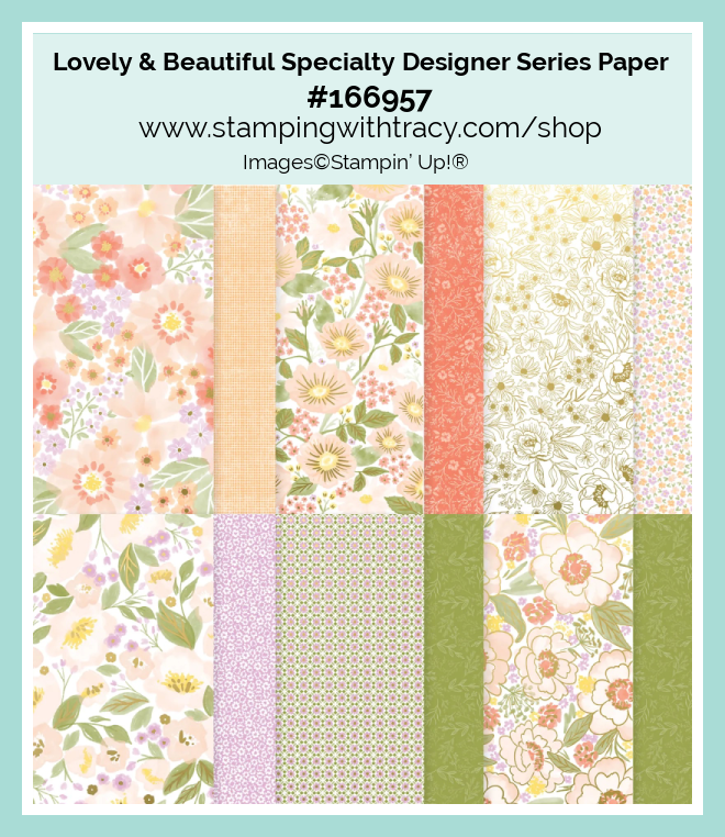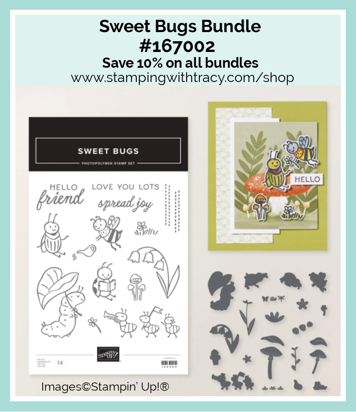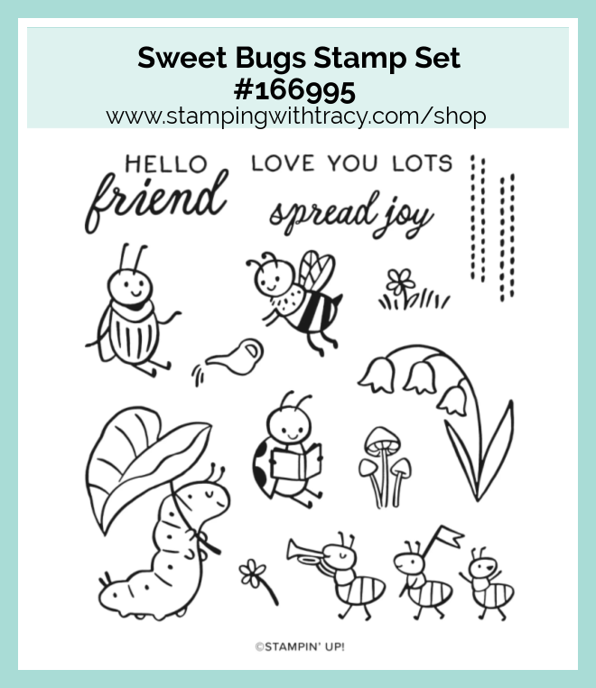 I’m sharing a card I made using new products: The new products are Lovely & Beautiful Specialty Designer Series Paper and the Sweet Bugs Stamp Set. I also used the Stylish Shapes Dies and Low Profile Sparkle Dots.