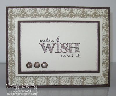My card today uses the same layout as my card HERE. I simply changed the papers, colors and embellishments. I tried to choose colors and brads that were more masculine. I think I could have used some brighter colors for my sentiment but I am happy with it. Luckily this stamp set, Make a Wish, will be carried over in the new catalog as well as the 3/8″ Glimmer Brads. The paper is from the Print Poetry Designer Series Pack that will be retiring on May 31st when the Spring catalog goes away. I hope that we will see a new pack like this in the Winter catalog!