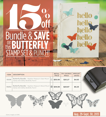 For a limited time you can purchase the Bitty Butterfly punch and the stamp set, Papillion Potpurri together and save 15%. Several weeks ago I showed this card which uses Papillion Potpurri! I didn’t use the Bitty punch but the Elegant Butterfly punch. The Bitty Punch was used on the inside of the card. If you would like to see the flyer enlarged, just click on it.
