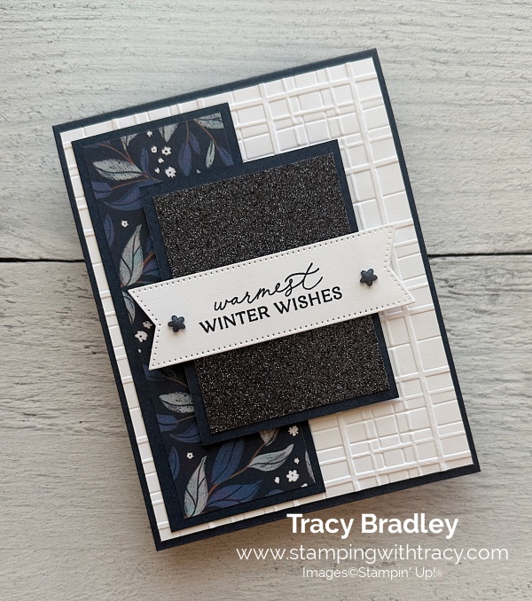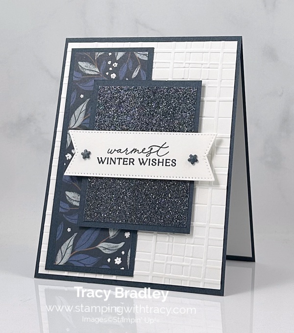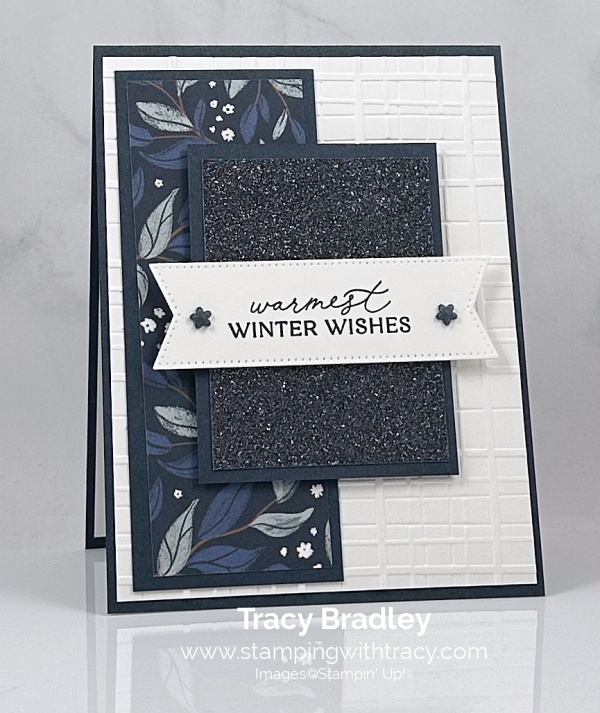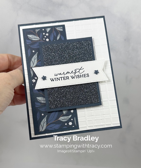 The card I’m sharing with you today was made using the Delicate Pines Stamp Set, Peaceful Garden Designer Series Paper, Peaceful Garden Glimmer Paper, Stylish Shapes Dies, Forever Plaid 3D Embossing Folder and Hues of Blue Flowers. You can see another version here using the same layout.