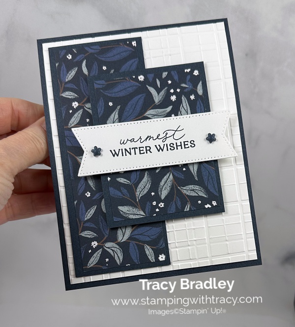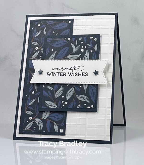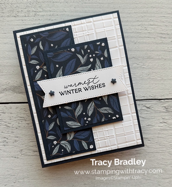 The card I’m sharing with you today uses the Delicate Pines Stamp Set (an Online Exclusive), Peaceful Garden Designer Series Paper, Stylish Shapes Dies, Forever Plaid 3D Embossing Folder and Hues of Blue Flowers. You can see another card, here, using the same layout
