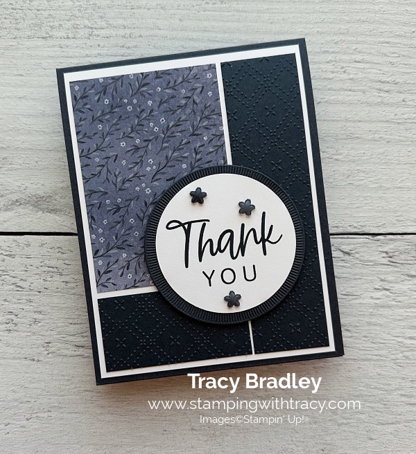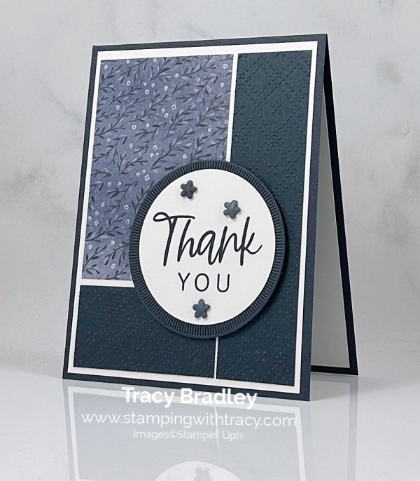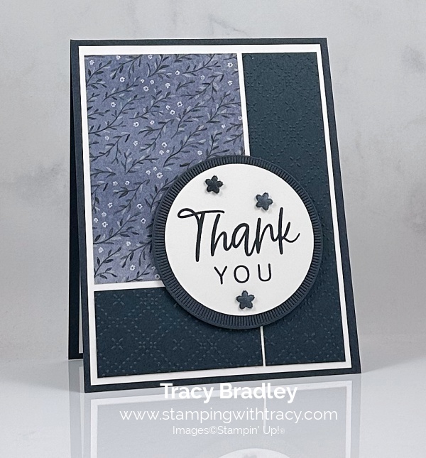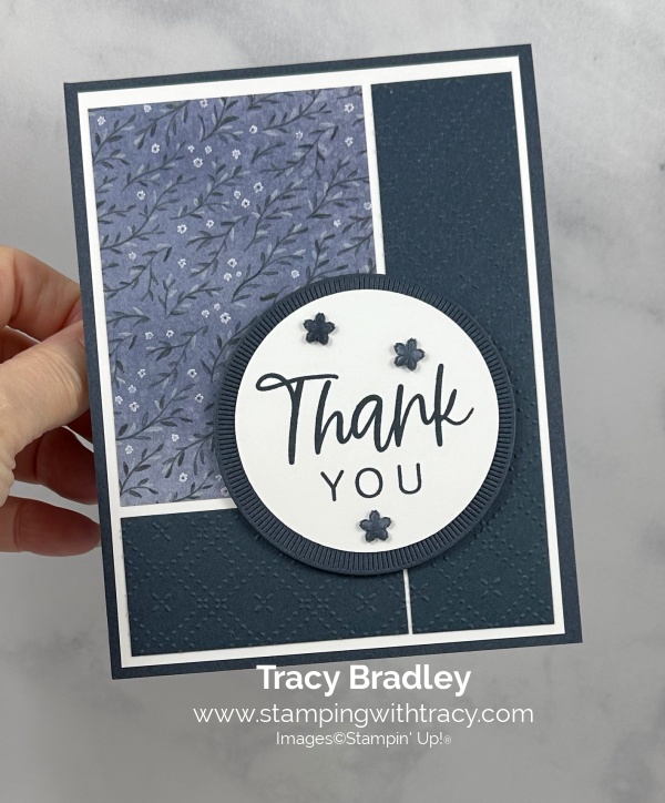 The card I’m sharing with you today was made With You in Mind Stamp Set (an Online Exclusive), Peaceful Garden Designer Series Paper, Spotlight on Nature Dies (an Online Exclusive), the 2-3/8 Circle Punch (an Online Exclusive), the Beautiful Pattern Embossing Folder (an Online Exclusive) and Hues of Blue Flowers.