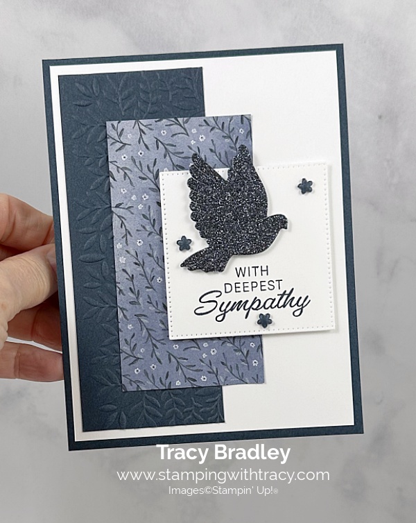 I used the Peaceful Garden Glimmer Paper to cut out a dove from the Peace on Earth Dies. Then, I added Stampin’ Dimensionals to the back of the dove and then adhered it to the square.