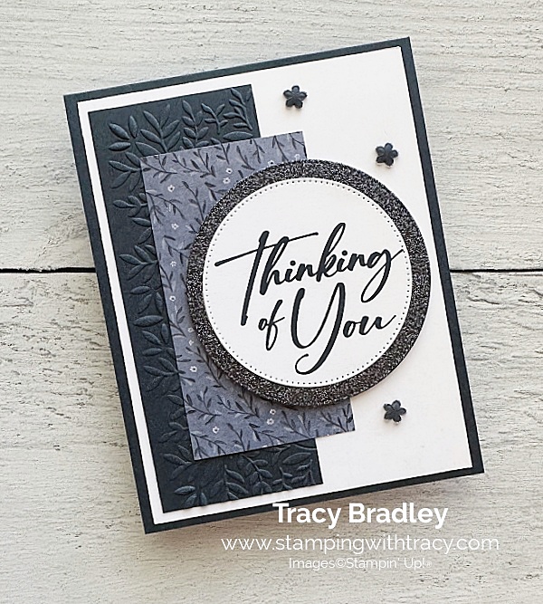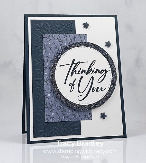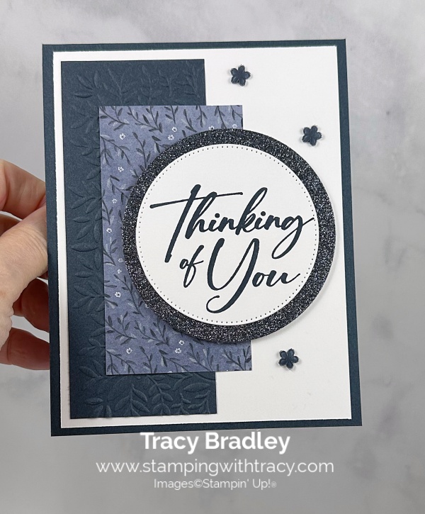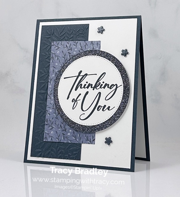 I cut a circle out of Basic White cardstock using the Stylish Shapes Dies (I used the second largest circle die). I stamped the sentiment to the front using the Sentimental Framing Stamp Set in Secret Sea ink. Then, I cut a circle out of Peaceful Garden Glimmer Paper (using the largest circle die). I added the sentiment to the Peaceful Garden Glimmer Paper, added Stampin’ Dimensionals to the back and adhered it the card front.