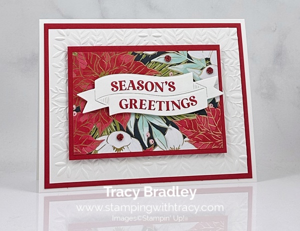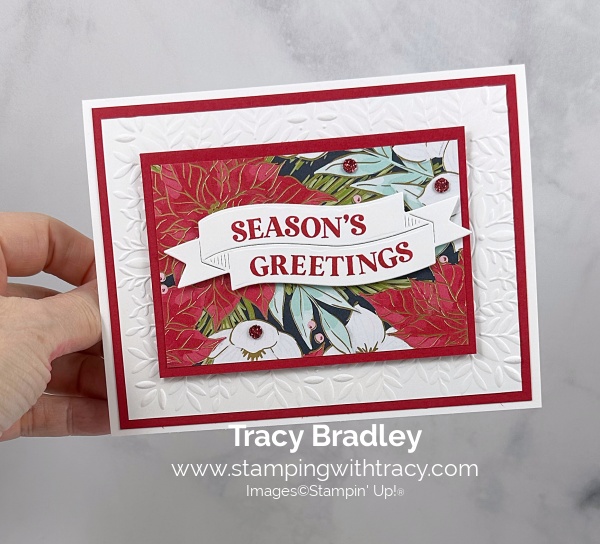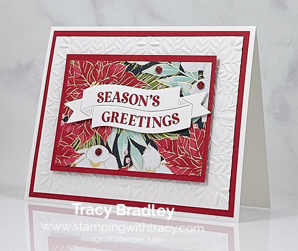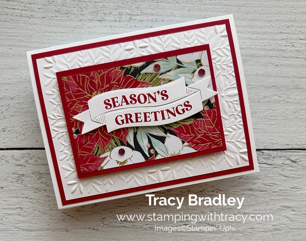The card I’m sharing with you today was made with the Traditional Labels Bundle, Traditions of Christmas Specialty Designer Series Paper, Peaceful Greenery 3D Embossing Folder and Traditional Sparkling Sequins. You can see another card using this same layout, from September here.