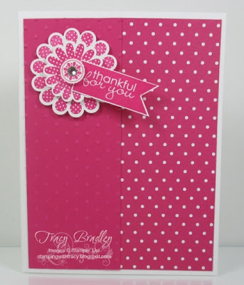 The pretty polka dot paper is from the Brights Designer Series Paper Stack. It is 12×12 paper in all 10 colors in the Brights collection. My flower comes from the set Polka Dot Pieces. I stamped the large flower image once and punched it out with the 1 3/4″ Scallop Circle punch. The smaller flower was stamped twice. The center of one was punched out with the 3/4″ Circle punch and then I used the 1 1/4″ Scallop Circle punch for the entire flower. A rhinestone in the center gives it just a touch of bling. My sentiments are from the Hostess set, Banner Greetings.