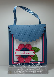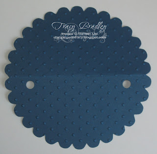 Scallop Circle Bigz die, cut out one piece in Midnight Muse. Fold the piece in half being sure to match up the scallops, open it up and run it through the Perfect Polka Dots embossing folder. Make two holes right below the score line, this will be for your handle.
