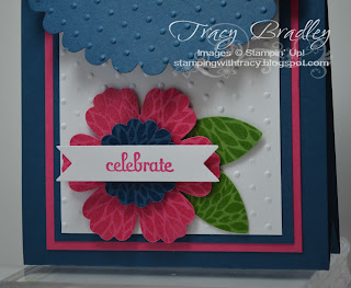 I used a technique on my flower and leaves that I saw the Stampin’ Up! co-founder, Shelli Gardner demonstrate at Convention. I used the large flower from the stamp set Betsy’s Blossoms. I inked it up with Versamark onto Melon Mambo, Midnight Muse and Gumball Green cardstock. Then I sprinkled clear embossing powder over it. Using our new heat gun, it magically transformed my flower image! I then used the Blossom Punch, new 1 1/4 inch Scallop Circle punch and the Blossoms Builder Punch and cut out my shapes. Each one has the design from the stamp and in person it is very shiny. I love the effect! My sentiment was cut out with the new Bitty Banners Framelits.