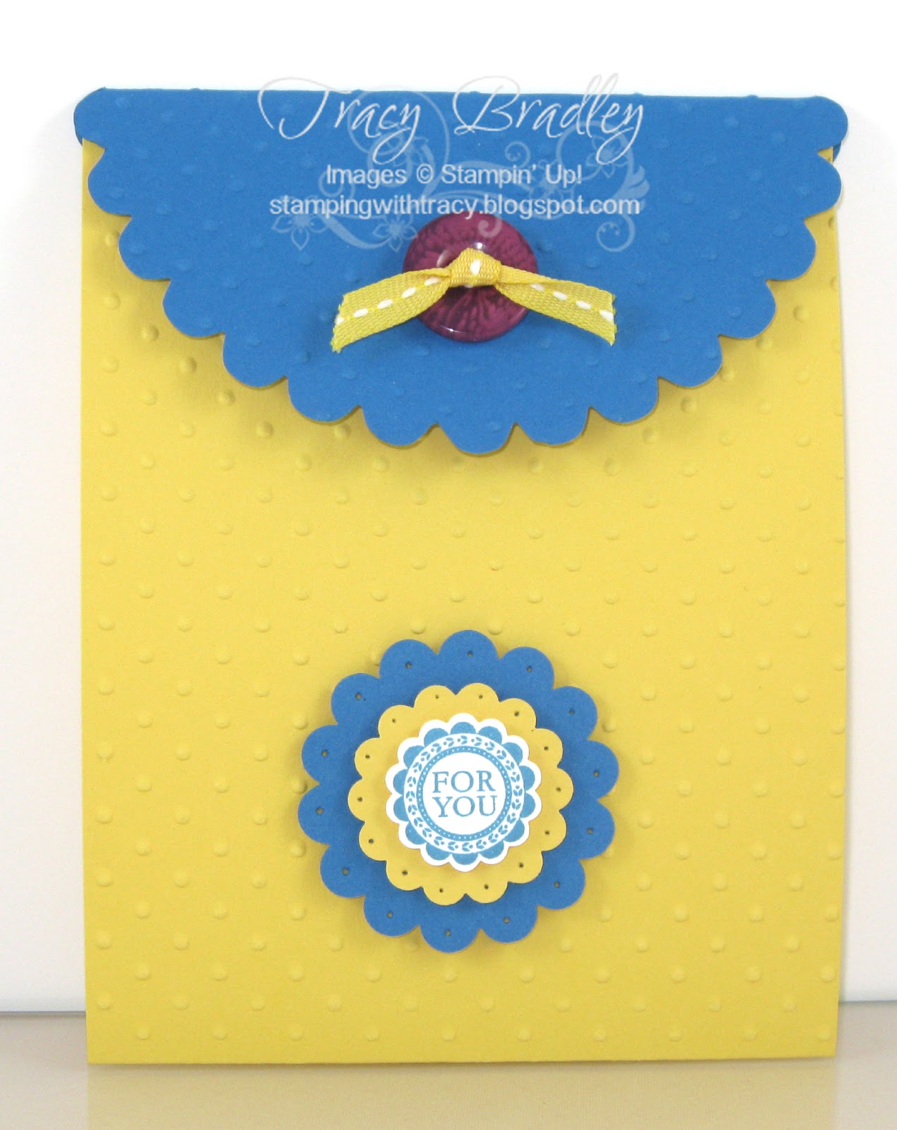 This is one of the cards that we made at my Stamp Clubs last week. Because it has a Velcro opening, it is sort of like a mini present and you could easily adhere a gift card on the inside with glue dots. I used the stamp set A Round Array which is a sneak peek item from the new 2013-2014 catalog and is only available in clear mount. If you purchase the stamp set and the 7/8″ Scallop circle punch (Spring Surprise Bundle), you will receive a 15% discount! Be sure to use this number for the discount: #133899. You can visit my Stampin’ Up! online store HERE