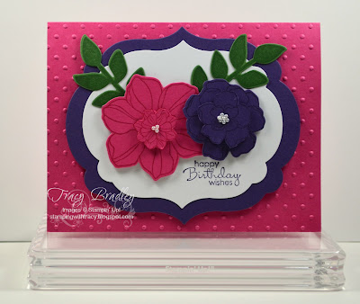I am ready for Spring and this card just screams Spring to me. I love these colors together – Melon Mambo and Elegant Eggplant. Do you know which new products I used from the Spring Catalog? The Secret Garden stamp set and the Secret Garden Framelits! If you are interested in purchasing both of these, the bundle is the best way to go because you will save 15%.