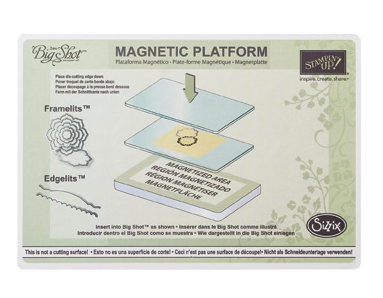 This is my VERY FAVORITE tool in the new catalog!!! I just received mine last week and I love it! When using Framelits, they tend to move around while on the multi-purpose platform. A common trick to keep them in place has been to use post it notes. But now with the new magnetic platform, no more post its!! When you place your Framelit on the platform, it instantly stays in place. You do have better results with cutting plates that are flat but at the moment I don’t have any flat ones and it is still working just fine. (There is a warning on the side of the platform that this product should not be used by anyone with a pacemaker.) Here’s the video again on how to use the platform if you didn’t get a a chance to see it a few weeks ago when I posted it!