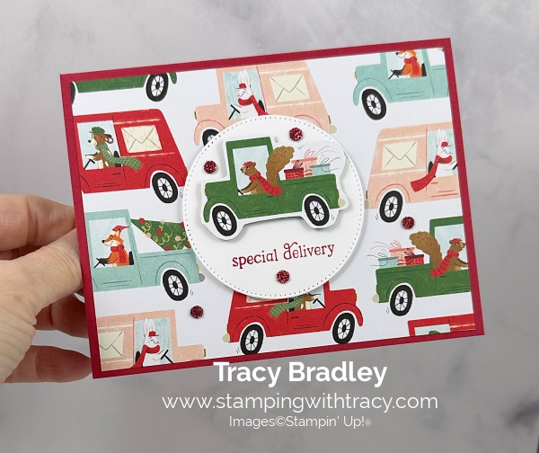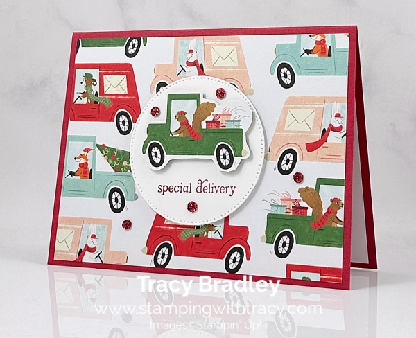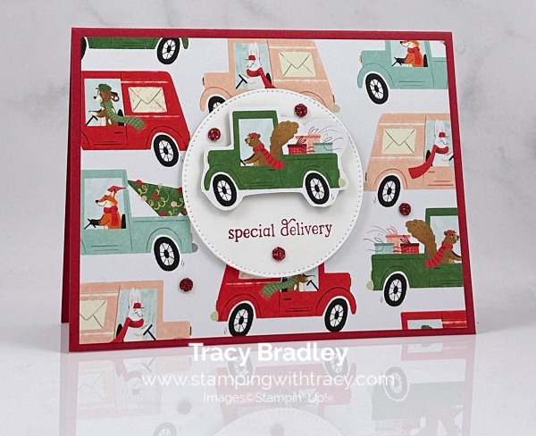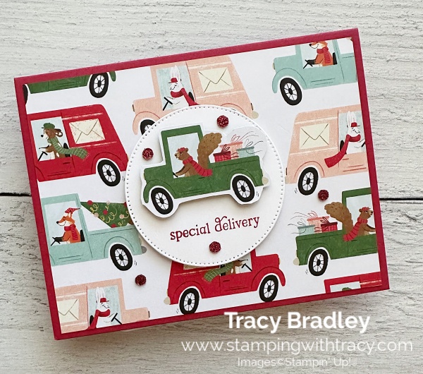 I used the Stylish Shapes Dies to cut a piece of Basic White cardstock (the second largest die). I stamped the sentiment onto the circle using the Jolly Delivery Stamp Set in Real Red ink. Using a small pair of scissors, I fussy cut the car out of the same pattern I adhered to the card front.