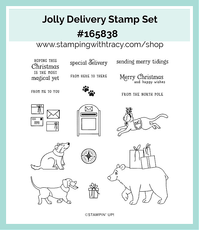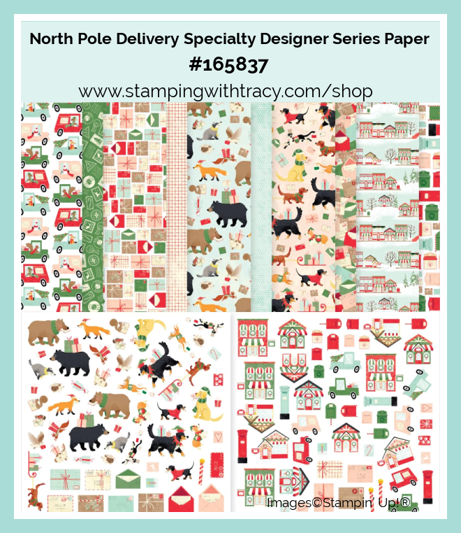 I’m sharing a Christmas card with you today. I used North Pole Delivery Specialty Designer Series Paper, the Jolly Delivery Stamp Set, Stylish Shapes Dies and Traditional Sparkling Sequins.