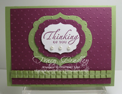 Today’s card uses another one of the new Framelits – the Labels Collection. The collection comes with six dies, my card shows you three of the sizes. The largest one is 5 7/16 inches wide. This is the only card I’ve made with this collection so I am looking forward to trying it out in so many different ways. I’ve also used the new pleated ribbon which is so pretty in person! My colors are Rich Razzleberry and Pear Pizzazz.