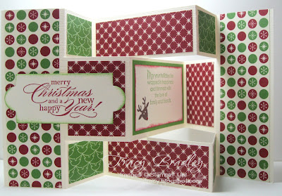Today I have another Tri-fold Shutter card for you. I used the same beautiful paper as the one HERE but I switched around the panels. My cute little reindeer inside is from the set Jolly Bingo Bits. There are so many different images in this set and I have definitely used it quite frequently in the last month! My sentiment was cut out with the Apothecary Accents Framelits and sponged with Gumball Green. This card would also be cute with photographs on some of the panels. The beauty of this card is that it folds up and is the same size as a traditional card.
