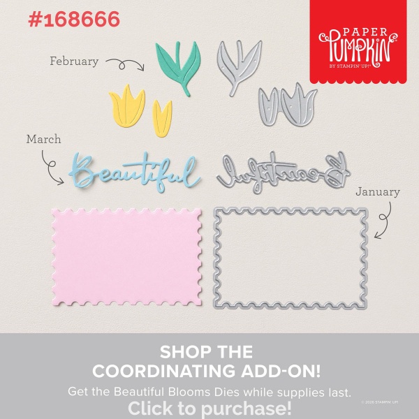 An additional coordinating add-on is available but only for Paper Pumpkin subscribers. Click the image below for more information. The dies below coordinated with January, February and March Paper Pumpkin kits!