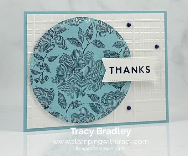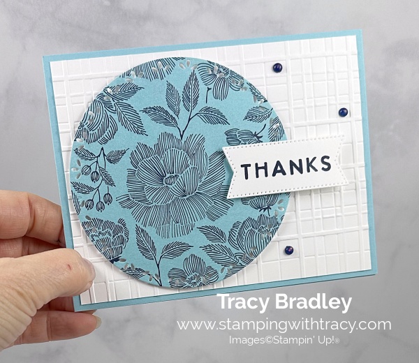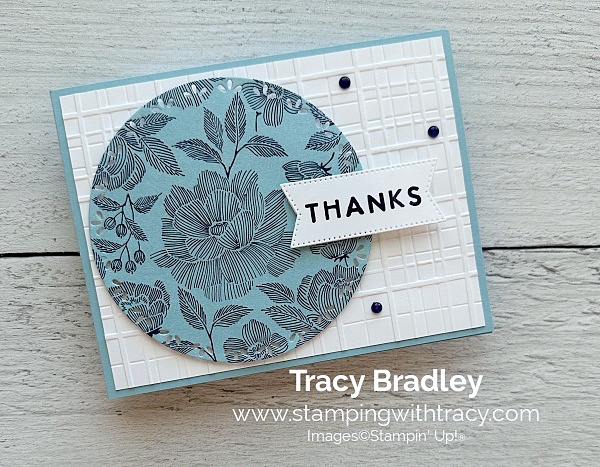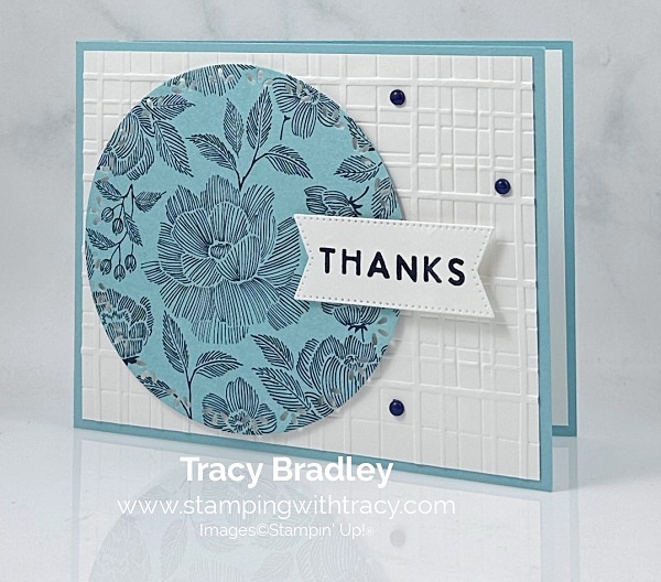 I’m sharing another card using the Product of the Month for December – True Blue Florals Designer Series Paper. I also used the Sunshine Vibes Stamp Set, Spotlight on Nature Dies (an Online Exclusive), Forever Plaid 3D Embossing Folder, Stylish Shapes Dies and Opal Rounds Assortment.