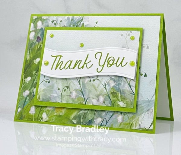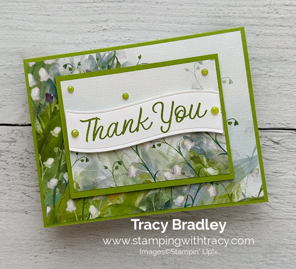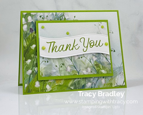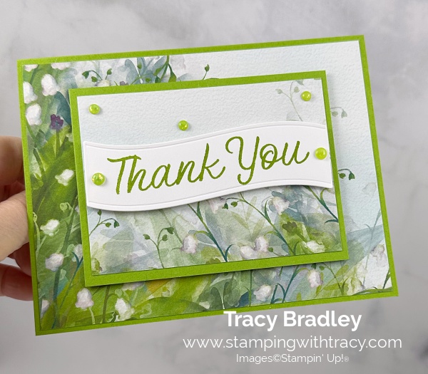 To complete my card, I added a piece of Basic White cardstock to the inside and added two large Shimmering Dots to each end of the sentiment in Granny Apple Green and three small Shimmering Dots to the Valley in Bloom Designer Series Paper – Valley in Bloom Designer Series Paper won’t be available until May 5, 2026. (The Shimmering Dots won’t be available for purchase until May 5, 2026).