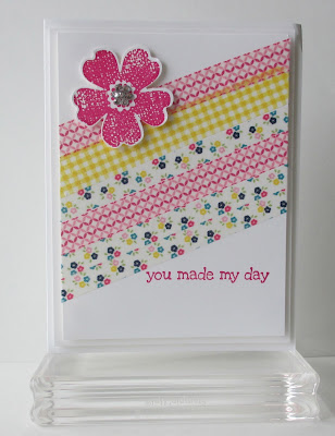 Today I have a card that I made using our Gingham Garden Designer Washi Tape. It is so easy to make a cute and quick card with this embellishment! I stamped a flower from the set Flower Shop and punched it out with our matching Pansy Punch. I added several rhinestones to the middle to bling it up. My sentiment is from A Dozen Thoughts, a set that I am in love with.
